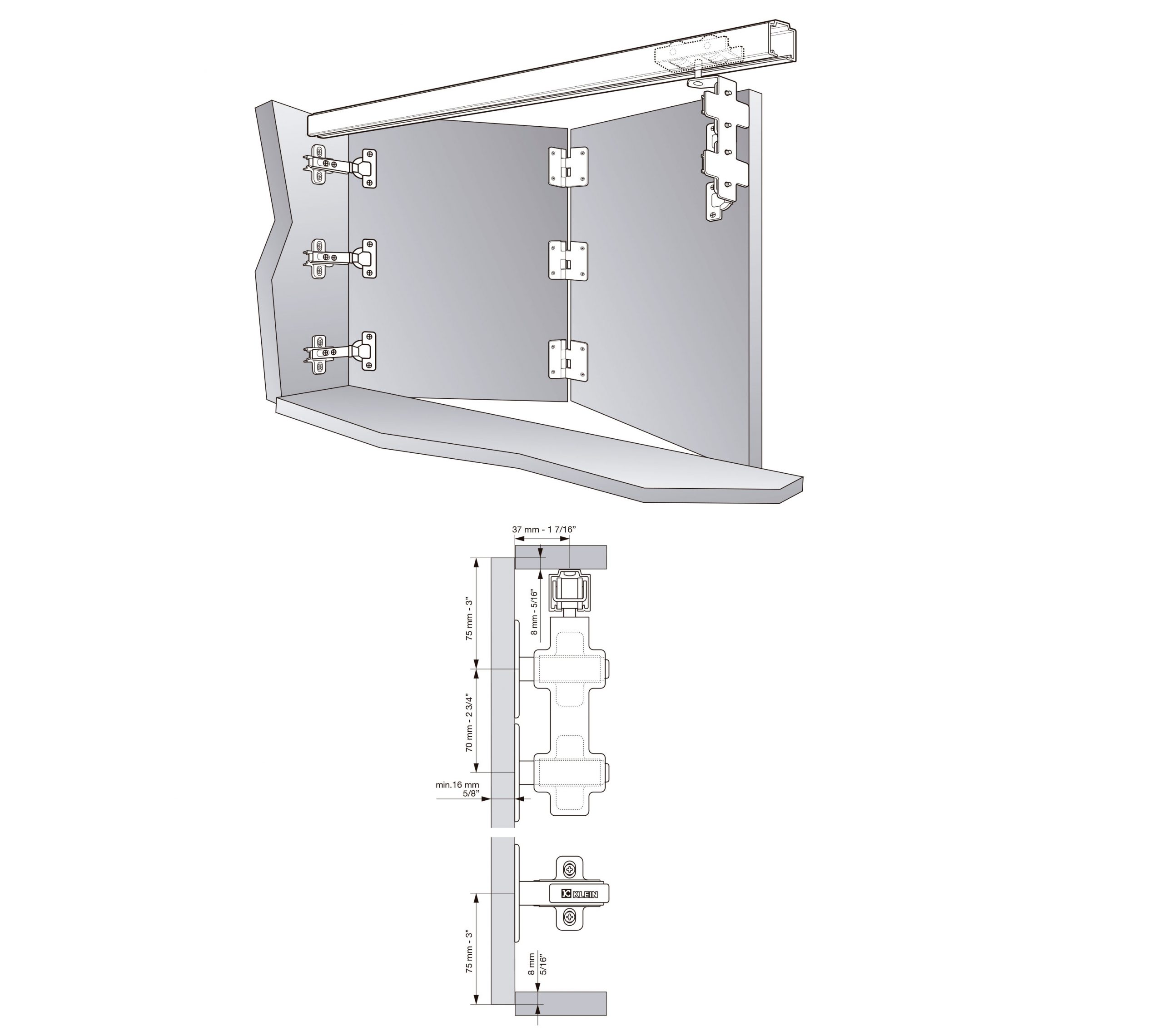 - Sistema PAR diseñado para armarios y muebles con puertas plegables con 16 mm mínimo de grueso.