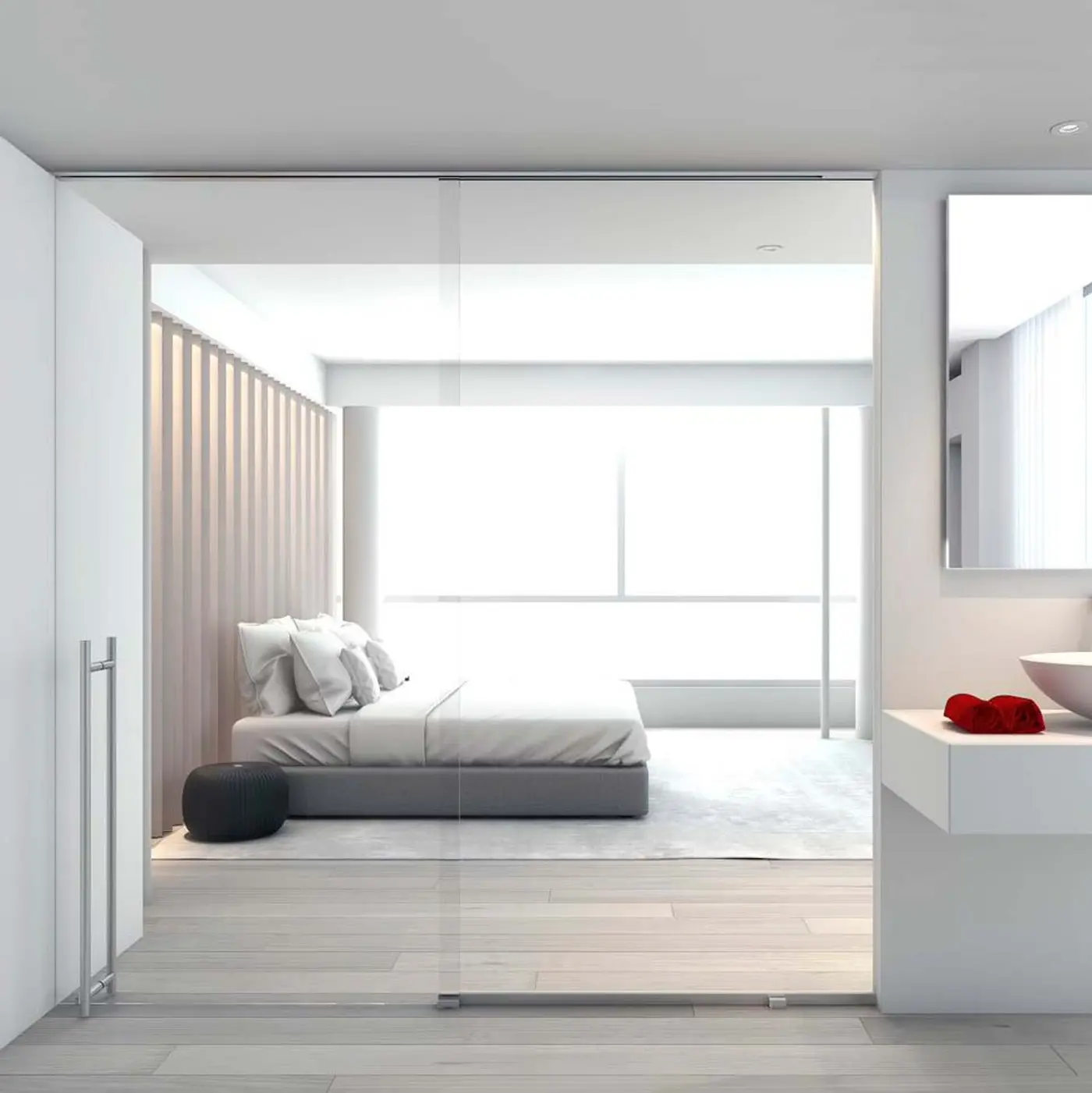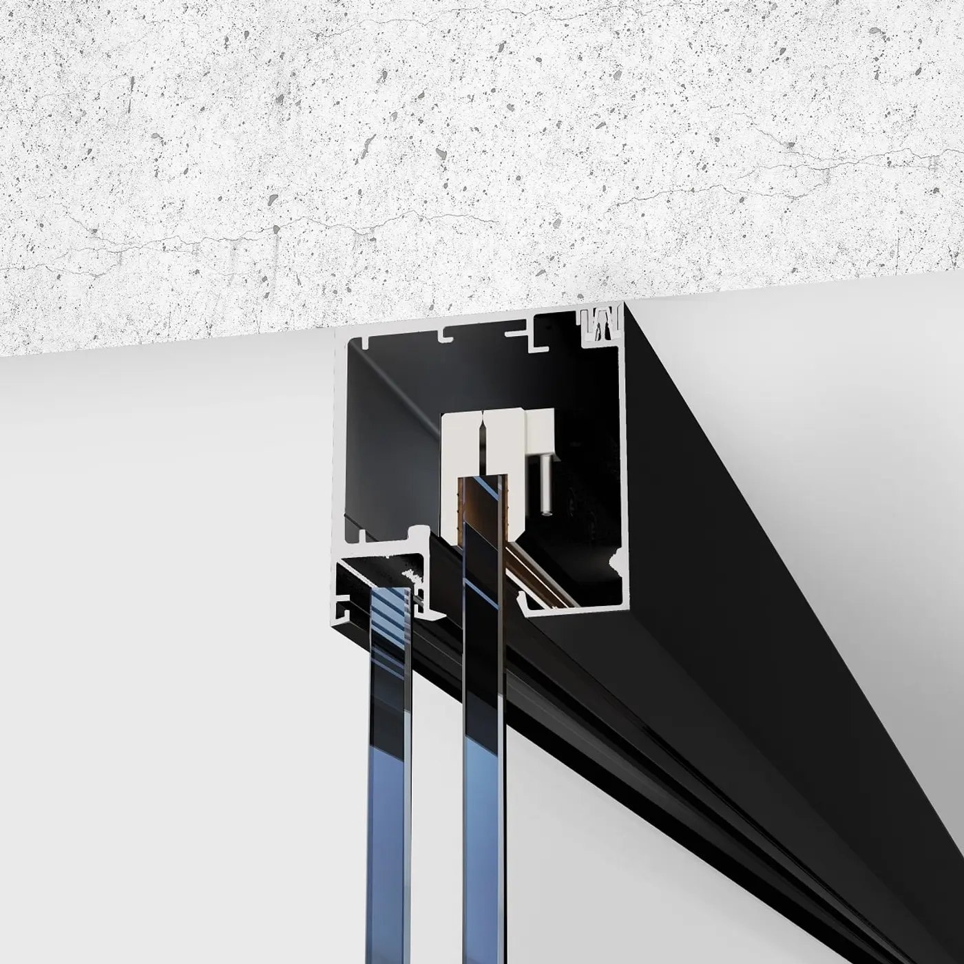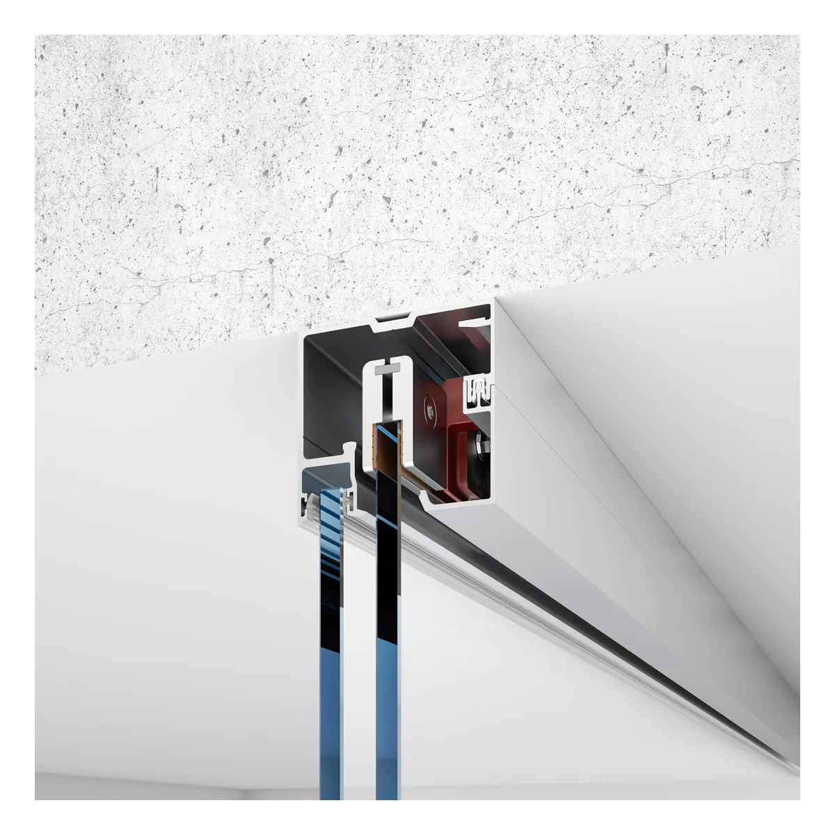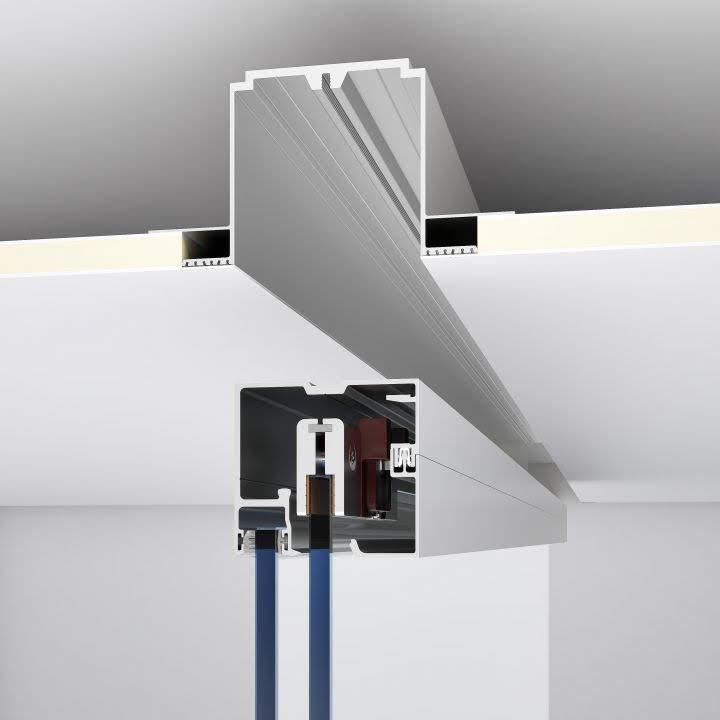 Gracias a su diseño técnico avanzado, la guía ROLLGLASS +100 puede instalarse vista, a techo o empotrada en falso techo, logrando una integración arquitectónica limpia y elegante, ideal para proyectos de interiorismo contemporáneo, oficinas y espacios contract.