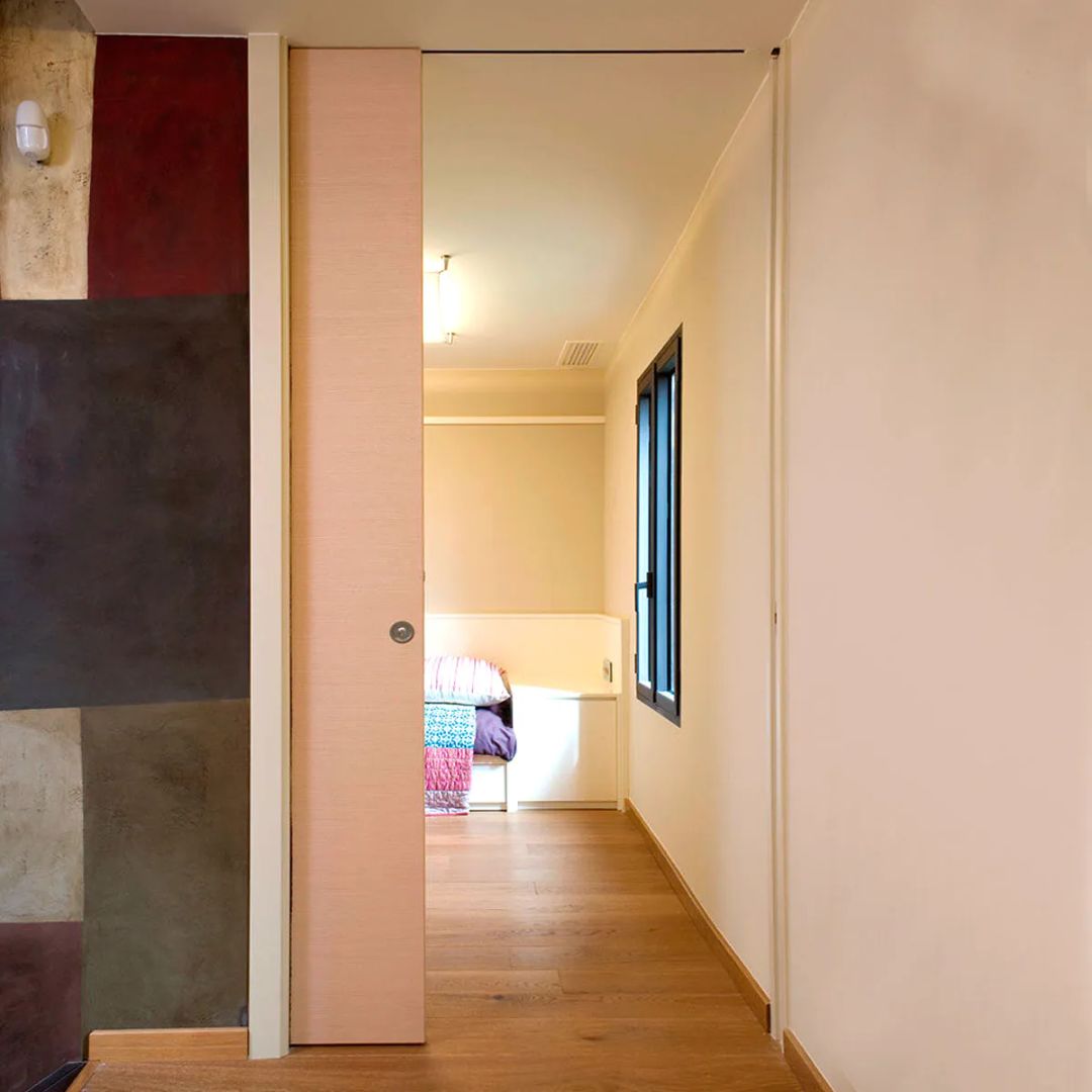 El sistema corredero Mekkit3D Krona Koblenz está diseñado para corregir pequeños desajustes durante el movimiento, permitiendo una auto alineación eficaz y ayudando a reducir vibraciones y ruidos generados durante el deslizamiento de la puerta.