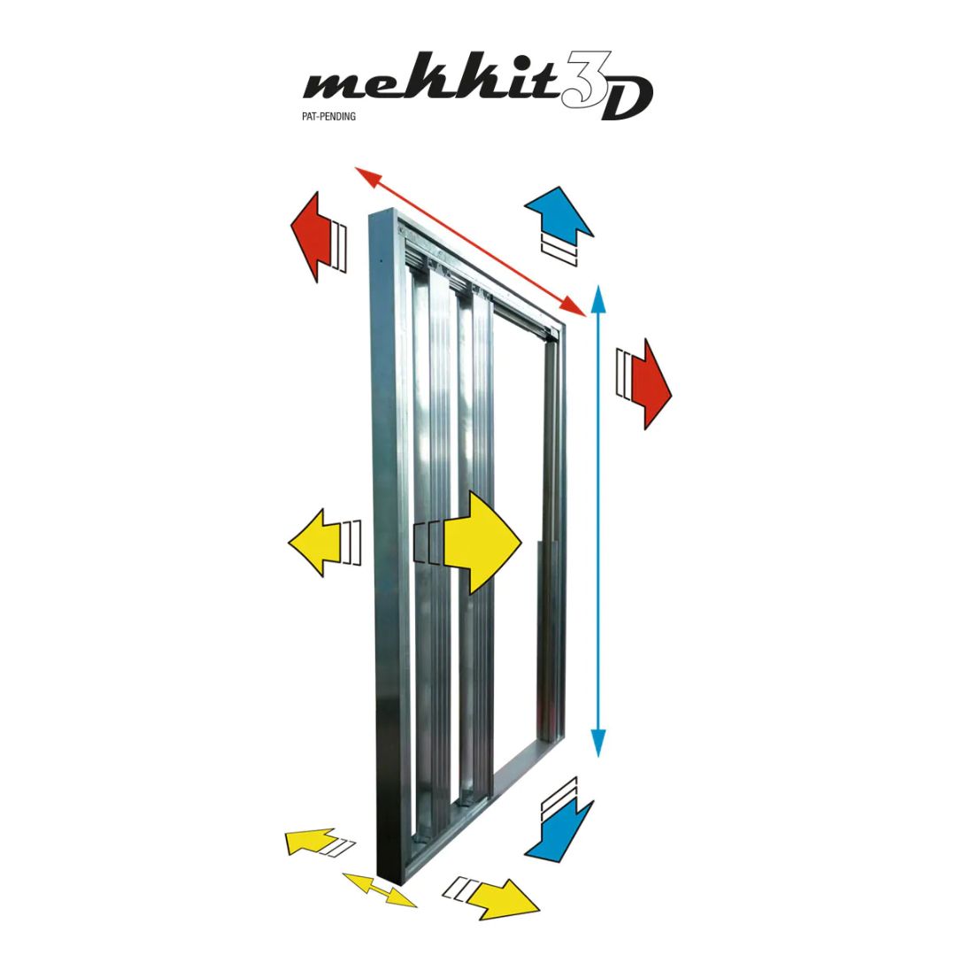 El Mekkit3D Krona es un innovador kit para puertas correderas diseñado para su instalación en paredes de cartón yeso. Su denominación 3D hace referencia a su capacidad de ajuste en tres dimensiones: altura, anchura y espesor, gracias a los componentes incluidos en el propio kit. Esta versatilidad permite adaptarse a distintos rangos de medidas y facilita la creación de armazones a medida, incluso en huecos con dimensiones especiales.