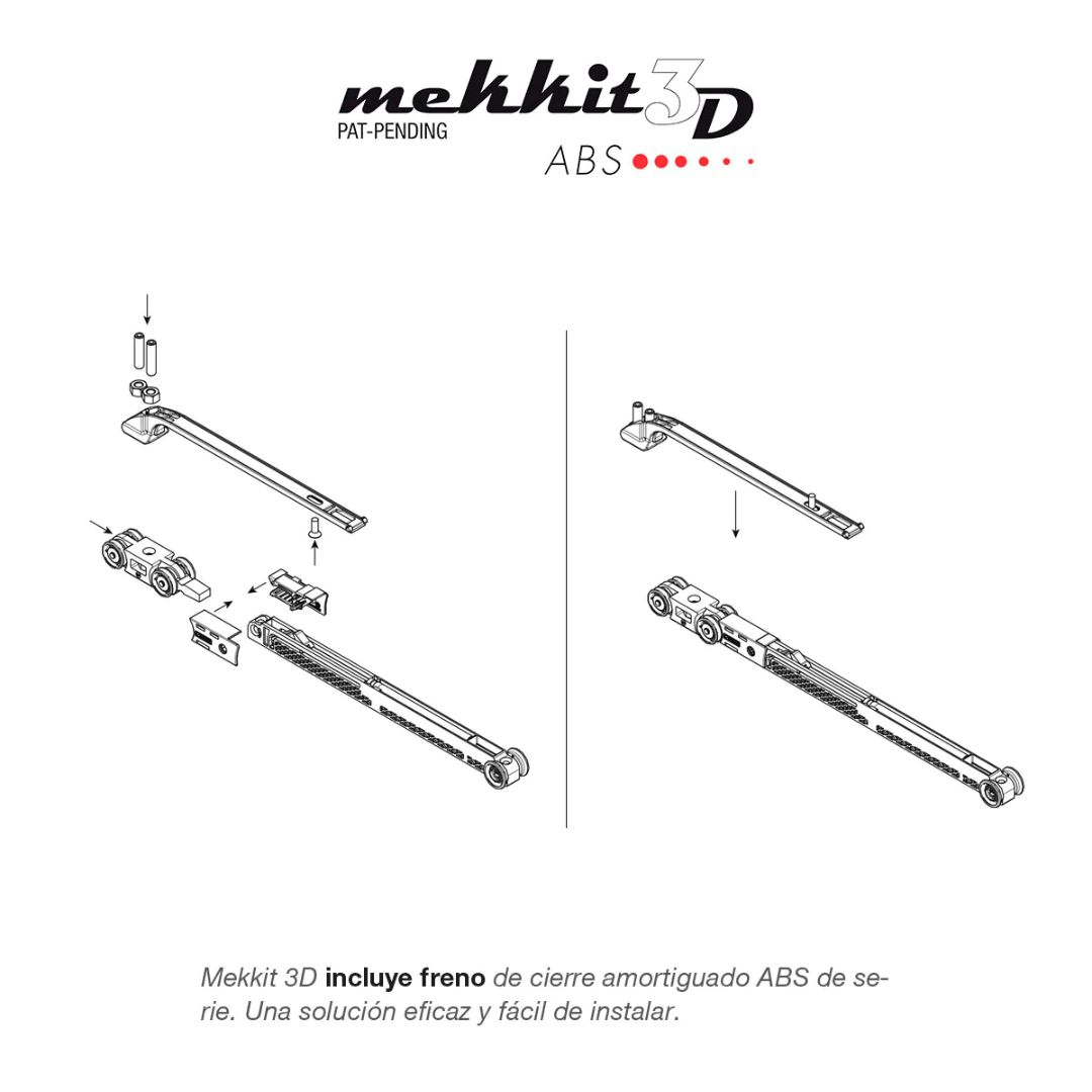 El sistema Mekkit3D incorpora de serie un freno de cierre amortiguado ABS, ofreciendo un deslizamiento suave, silencioso y una instalación sencilla y eficaz.