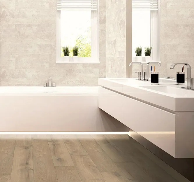 El Parquet de resina Flint HI FLOOR AC6 es 100% resistente al agua, perfecto para baños y cocinas, un suelo técnico, decorativo y ultra resistente, ideal tanto para uso doméstico como para entornos comerciales intensivos.