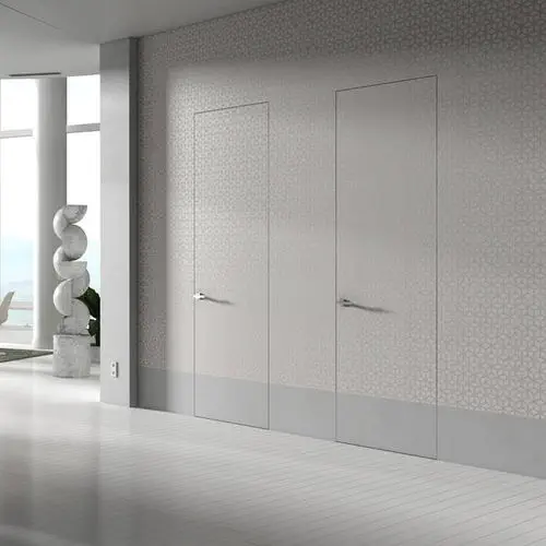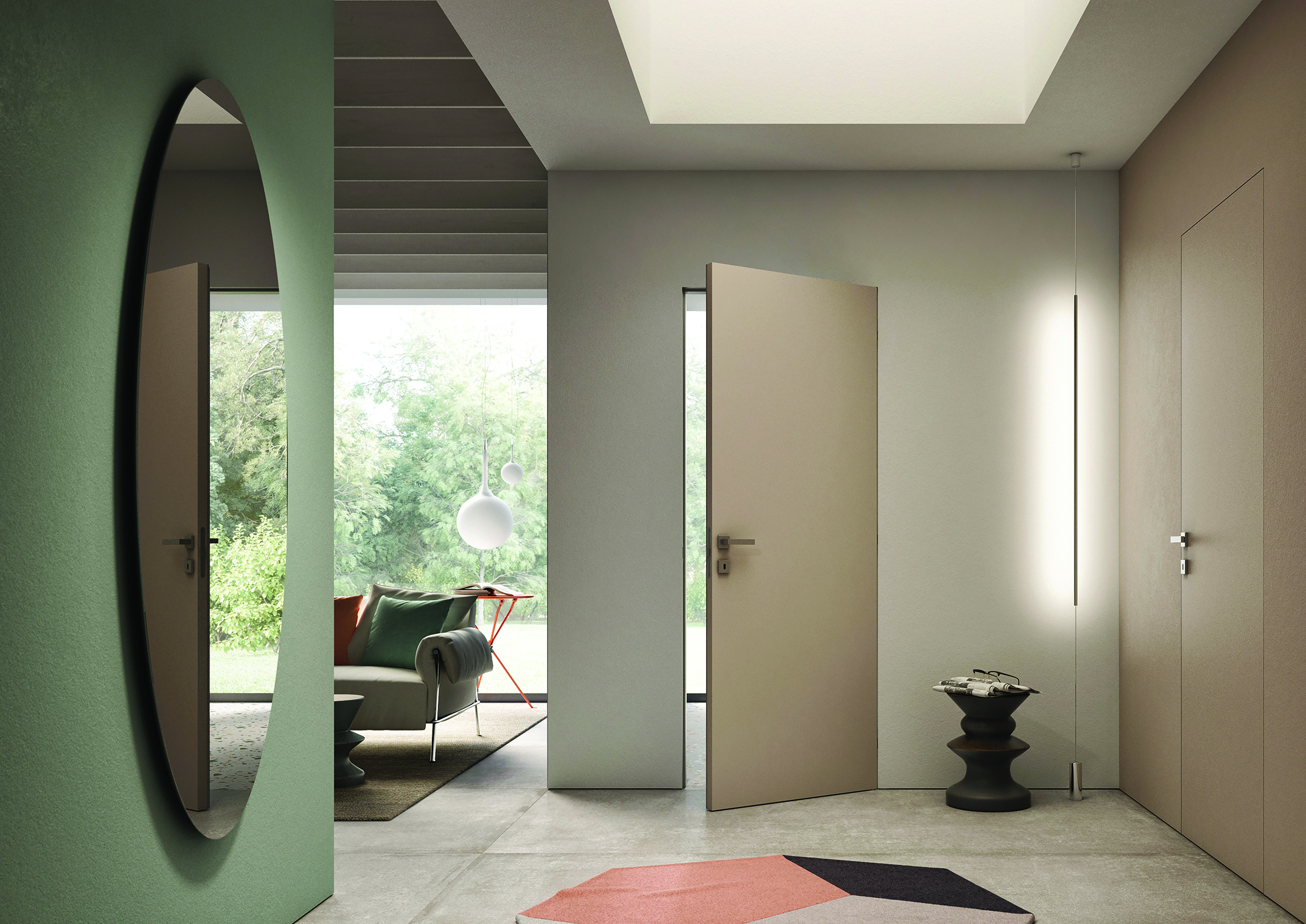 La Puerta rasomuro Scrigno Filo44 queda integrada con las pared por su marco ultra fino y minimalista.